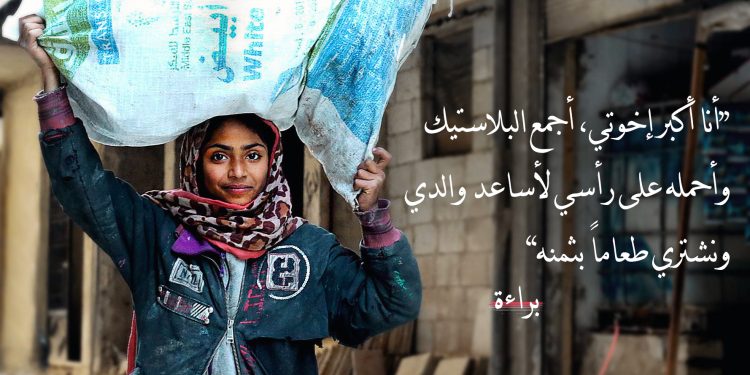 بوجه باسم ودمعة تأبى أن تنهمر؛ متحدية الظروف القاسية، تتحدث الطفلة ذات 15 ربيعاً عن طبيعة عملها الحالي “أنا أكبر إخوتي، أجمع البلاستيك وأحمله على رأسي لأساعد والدي ونشتري طعاما بثمنه”